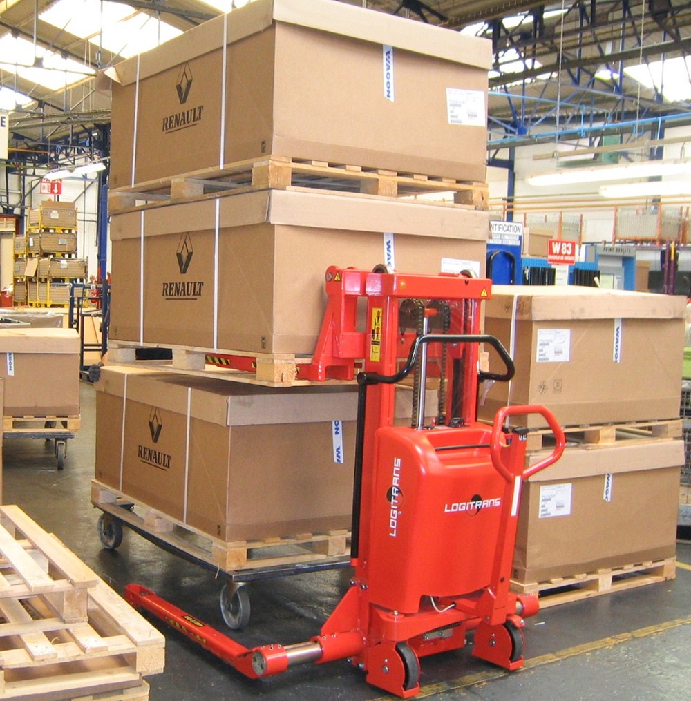 Logitrans SELF Maxi electric stacker trucks are used by a kitchen manufacturer. The stacker has an extra wide fork span to lift large pallets to a correct working height for packing. The stacker has powered drive, so pallets are transported to and from the warehouse with the same machine.